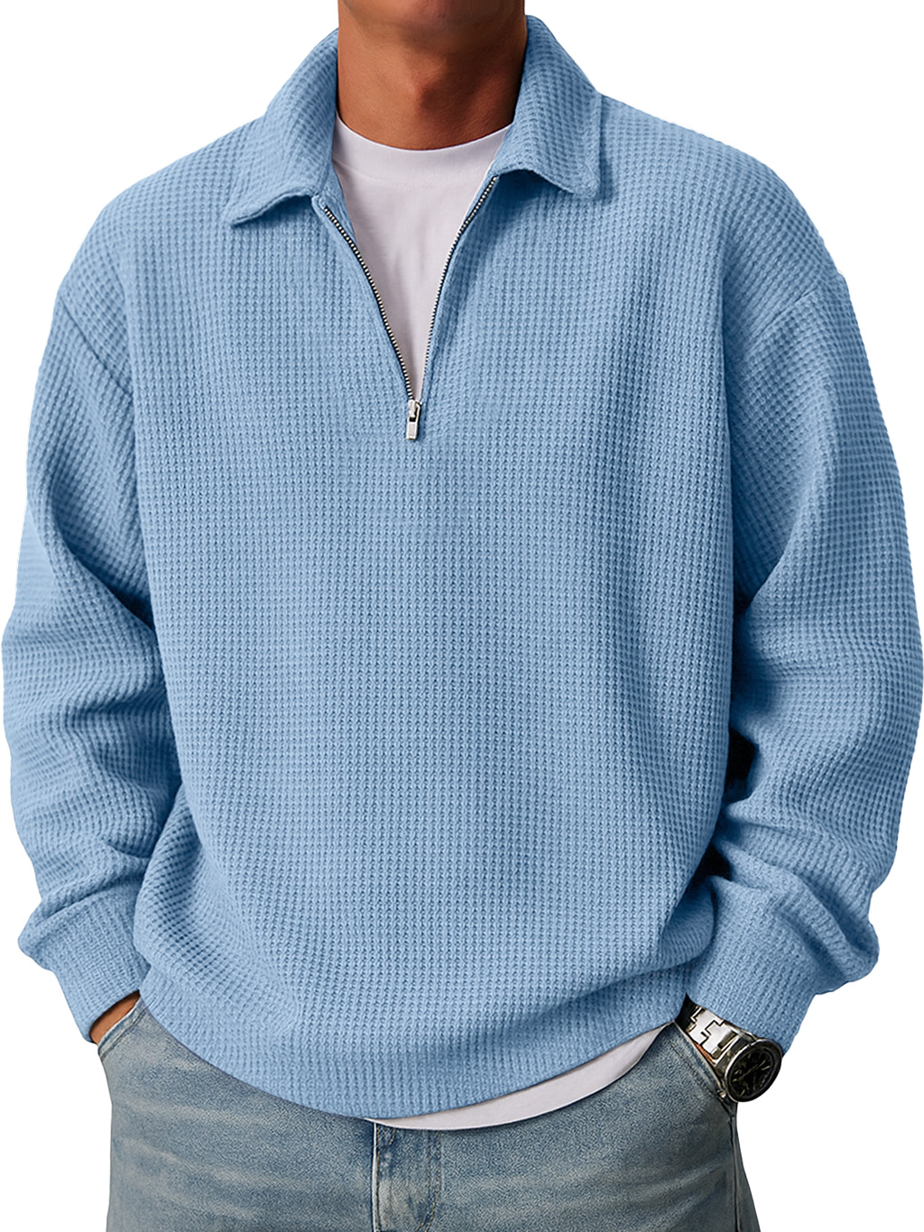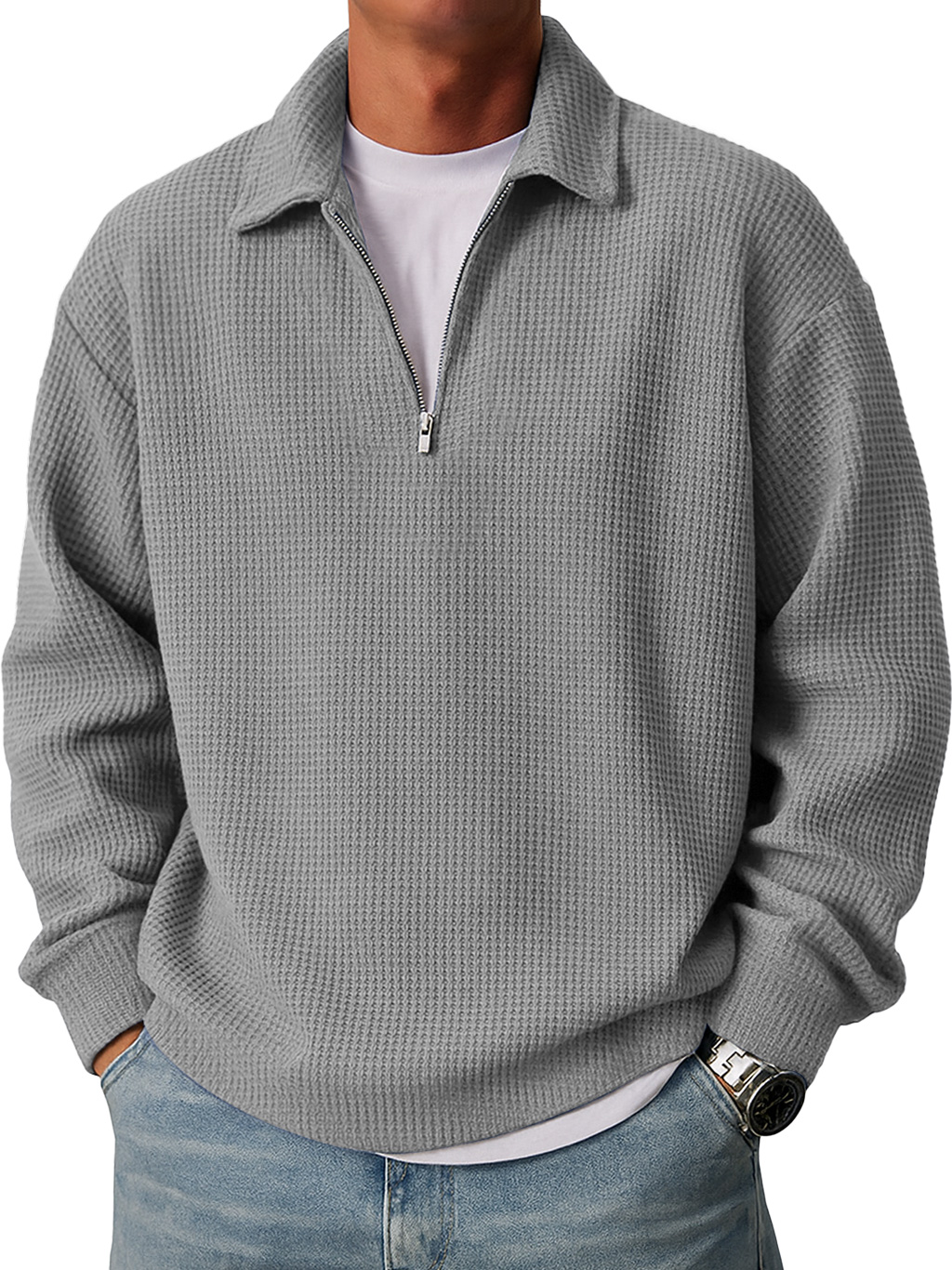 Men's Simple Loose Waffle Quarter-Zip Long Sleeve POLO Shirt