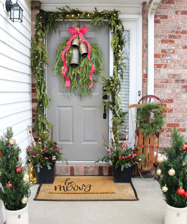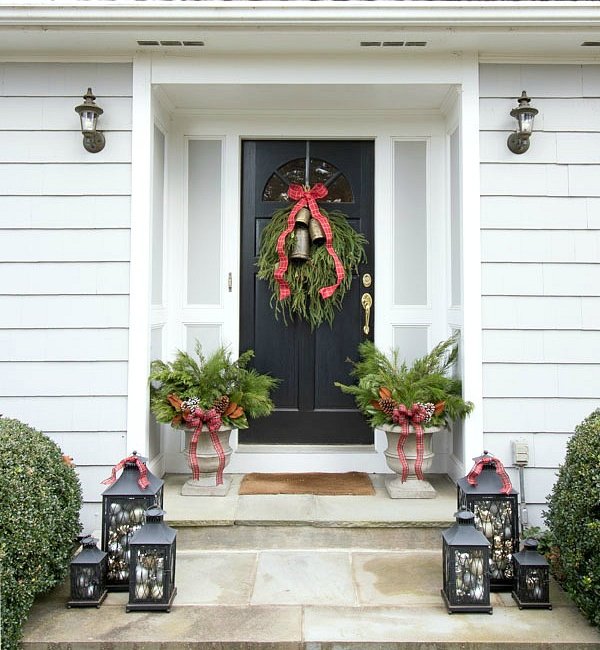 🔔Christmas house tour - a trio of lanterns filled with ornaments, planters filled with greenery, and a greenery swag on the front door are simple porch decorations for Christmas🔔