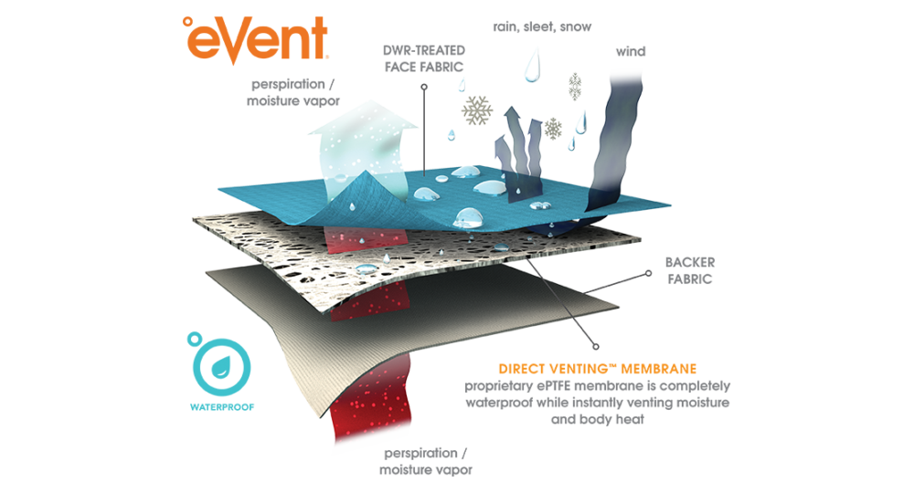 Event® Waterproof TechnologyIt provides excellent waterproofness and breathability through (Direct Venting™) technology, keeping users dry and comfortable in wet conditions.