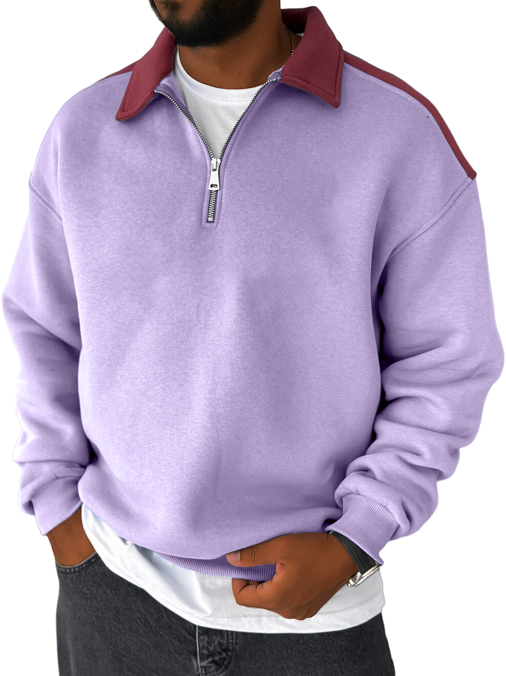 Men's Lapel Contrast Color Casual Loose Quarter Zip Sweatshirt