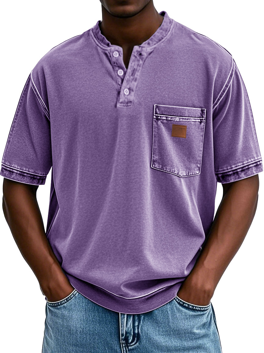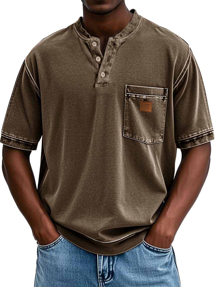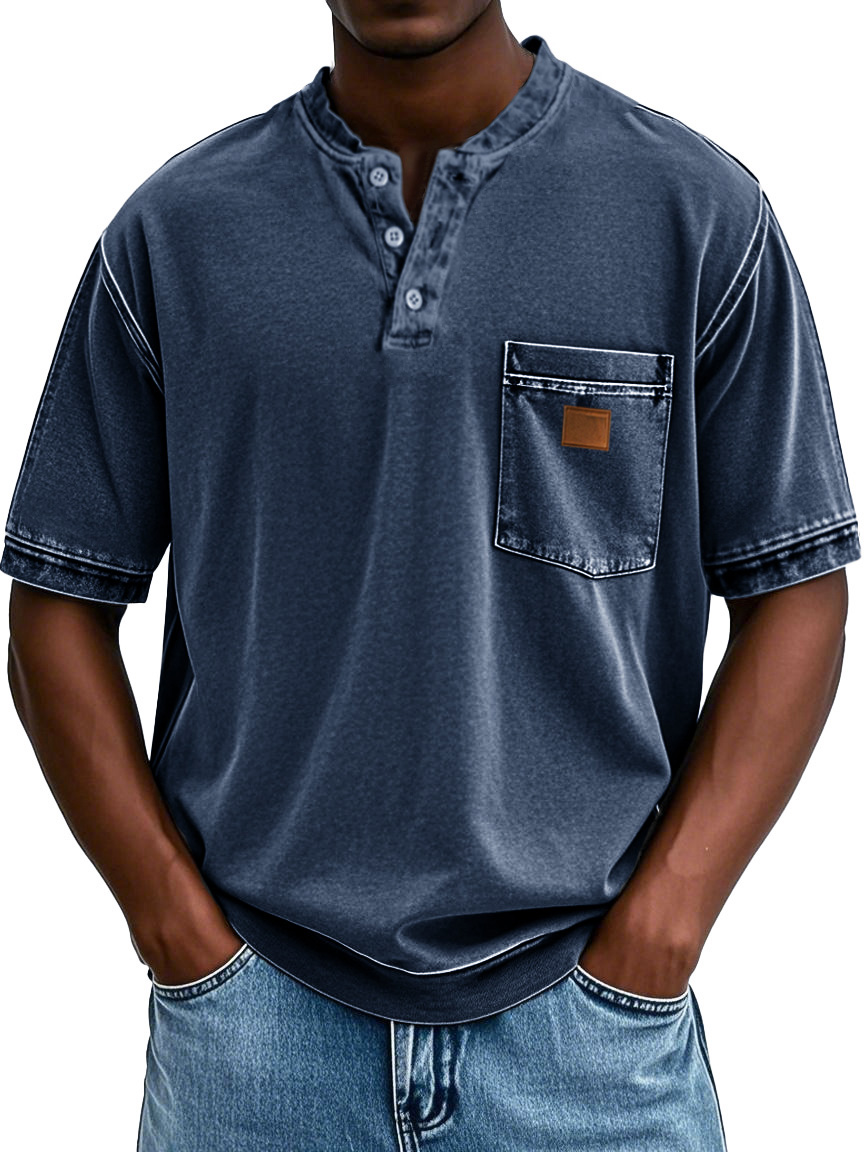 Men's Retro Distressed Embroidered Pocket Short-sleeved Henley Shirt