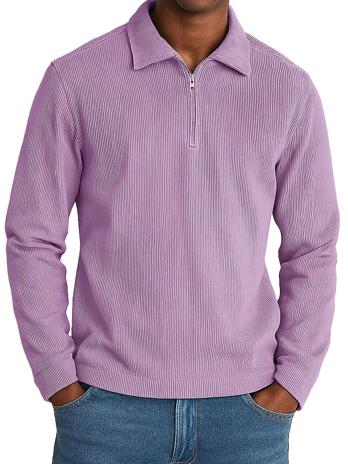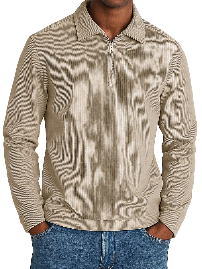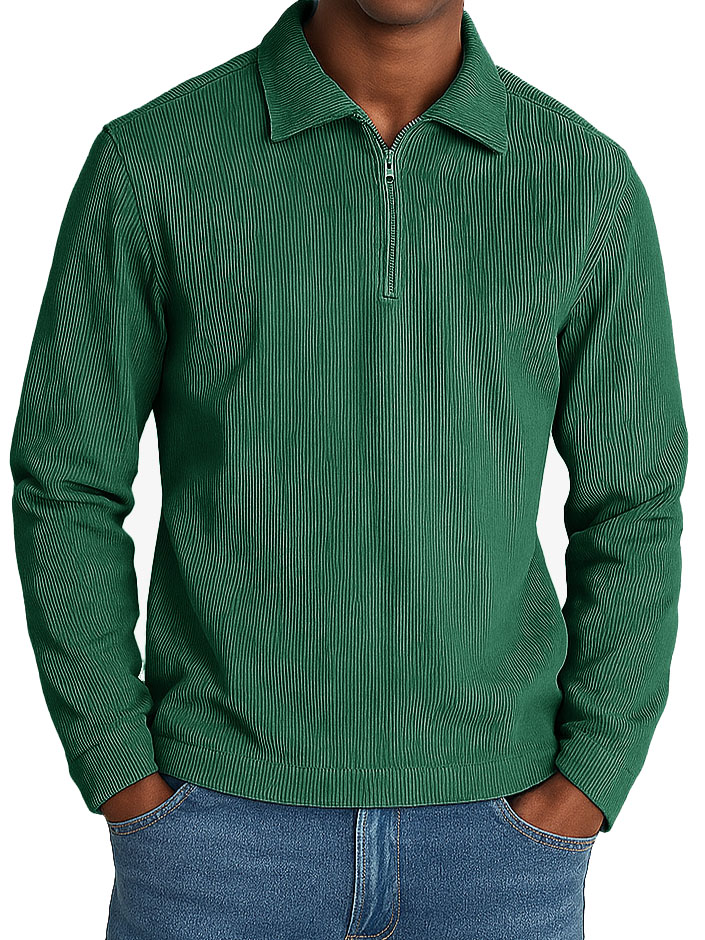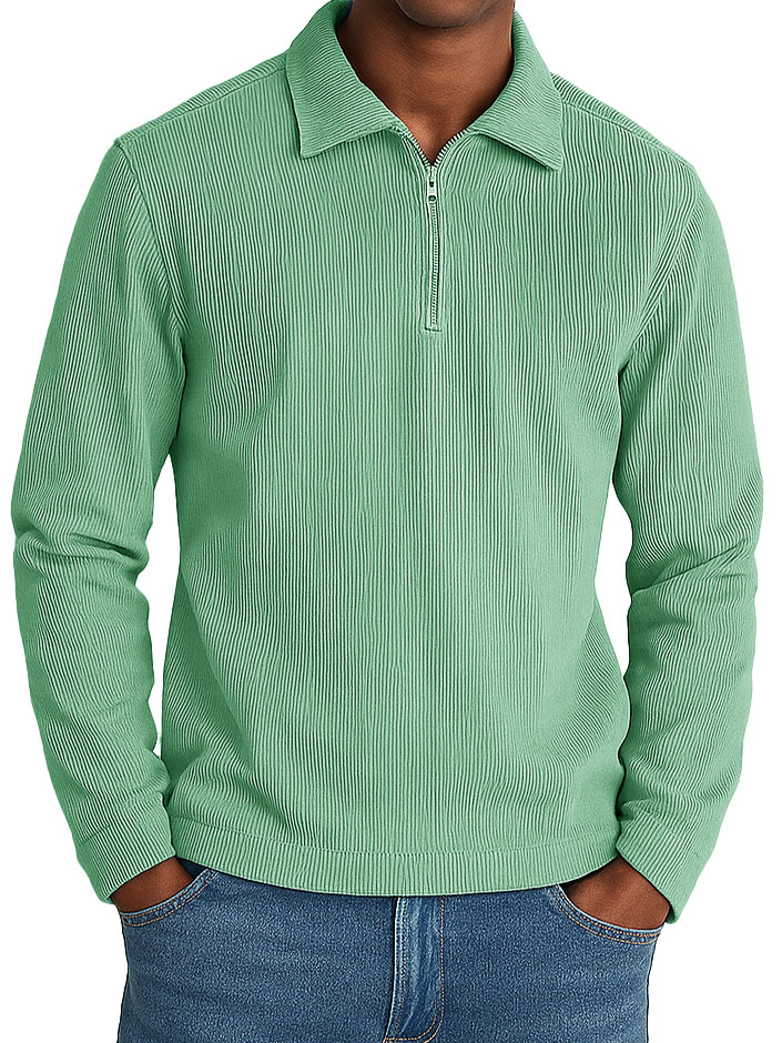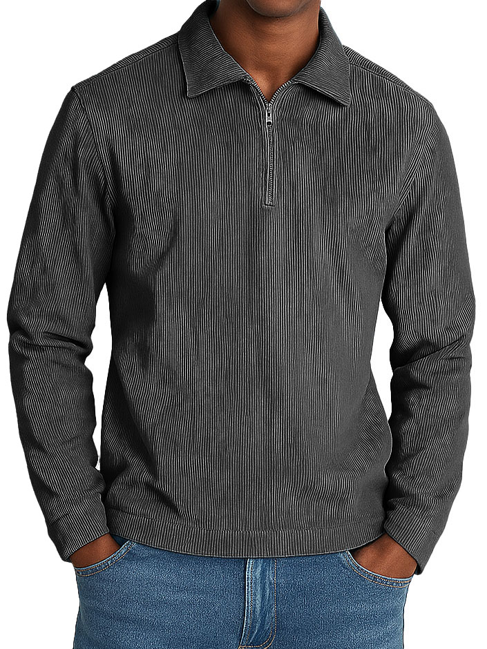Men's Stylish Casual Retro Lapel Corduroy Ribbed Fabric Long-sleeved Zip-up Polo Shirt