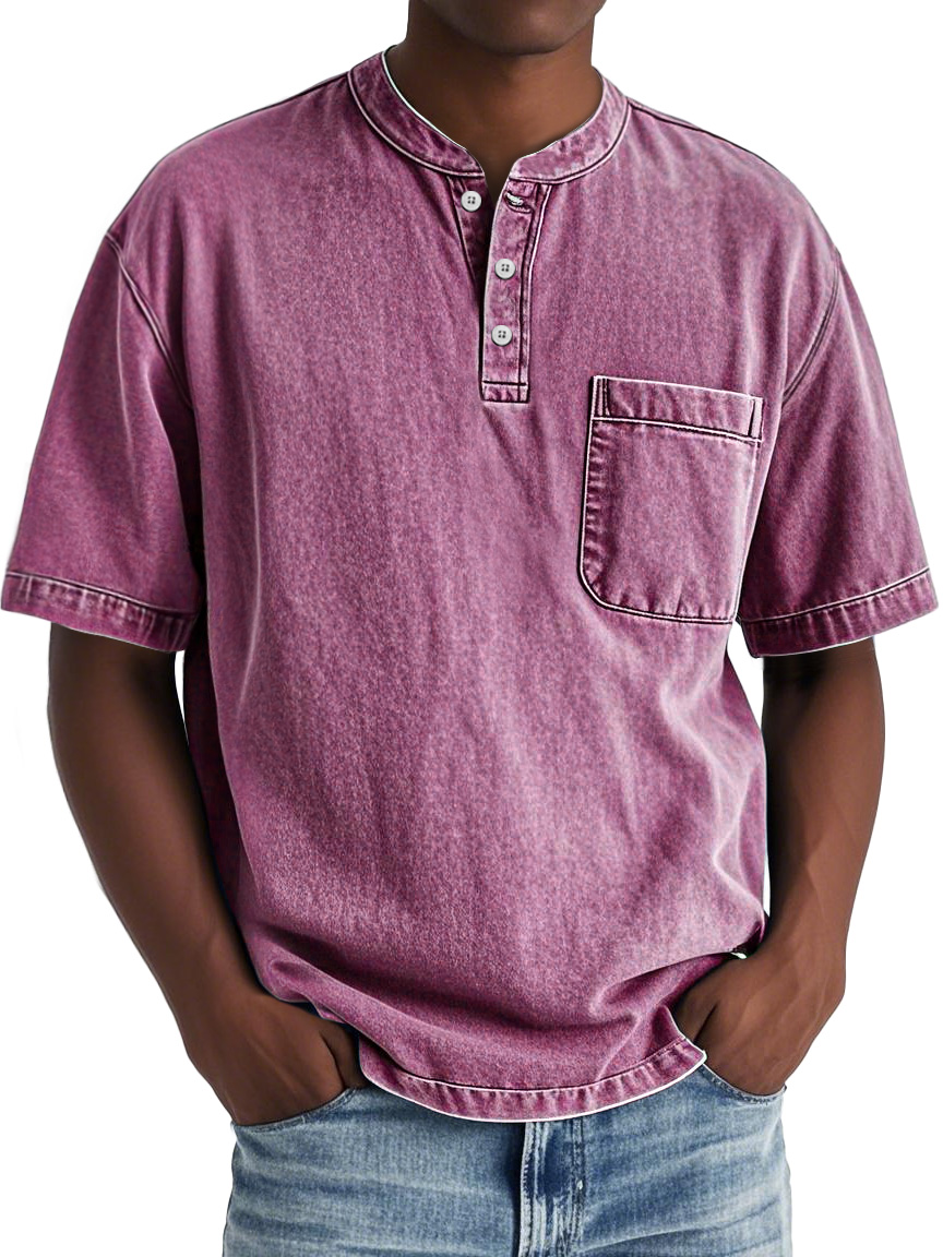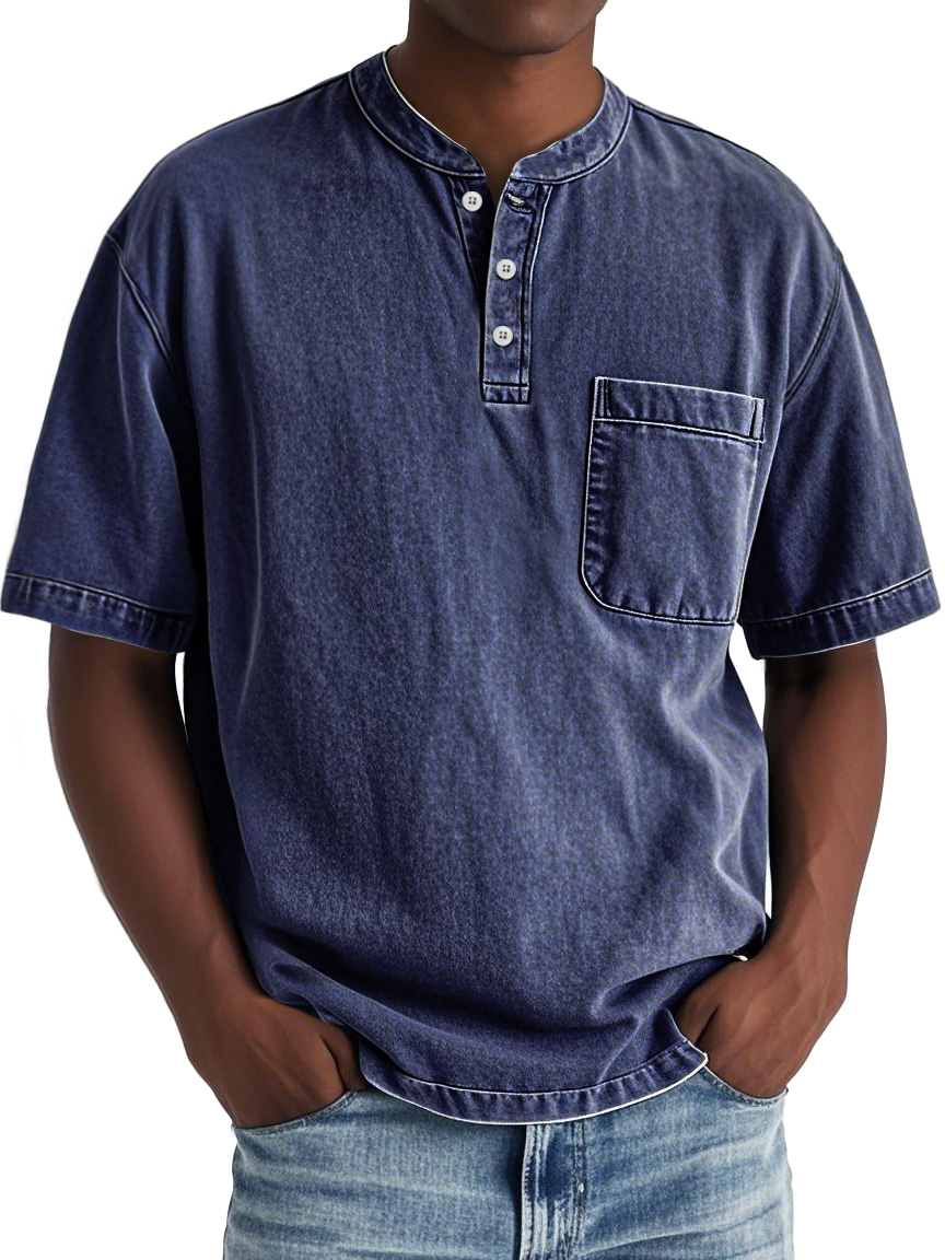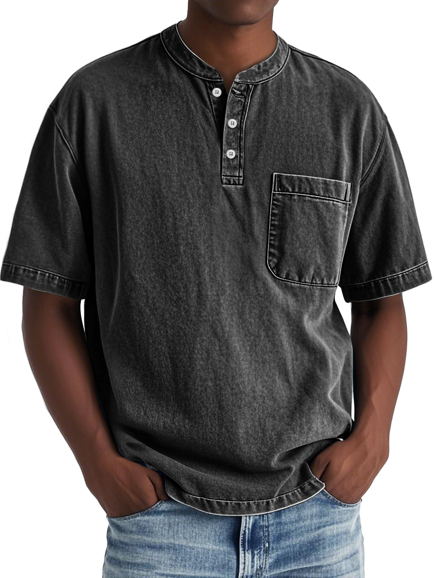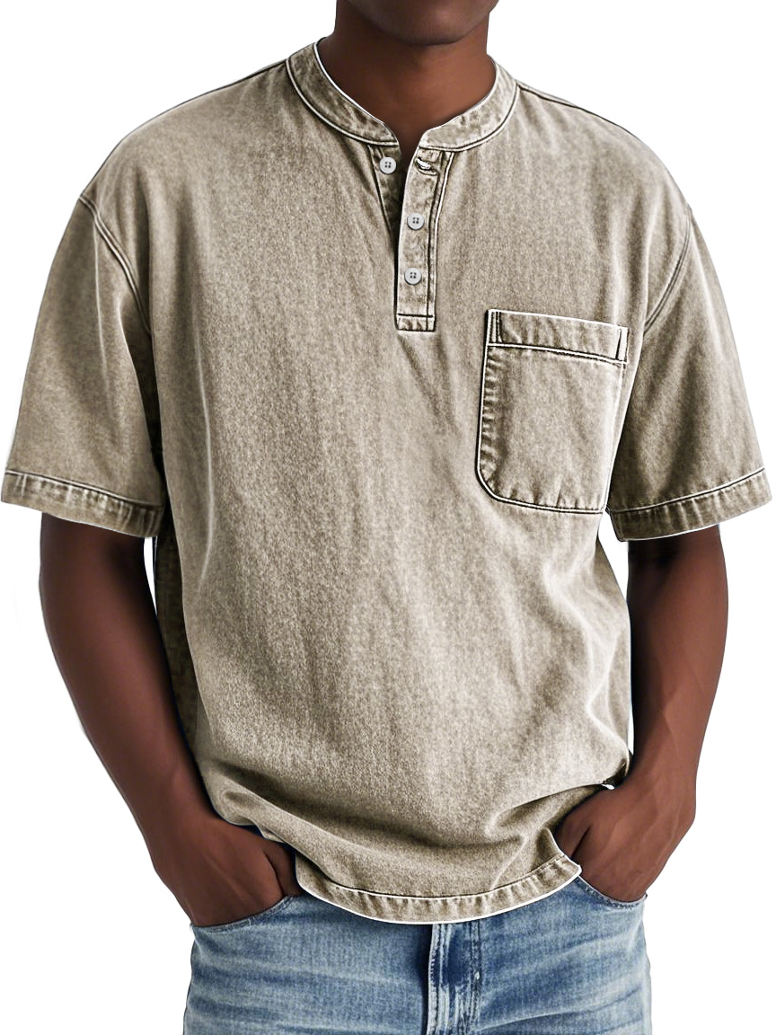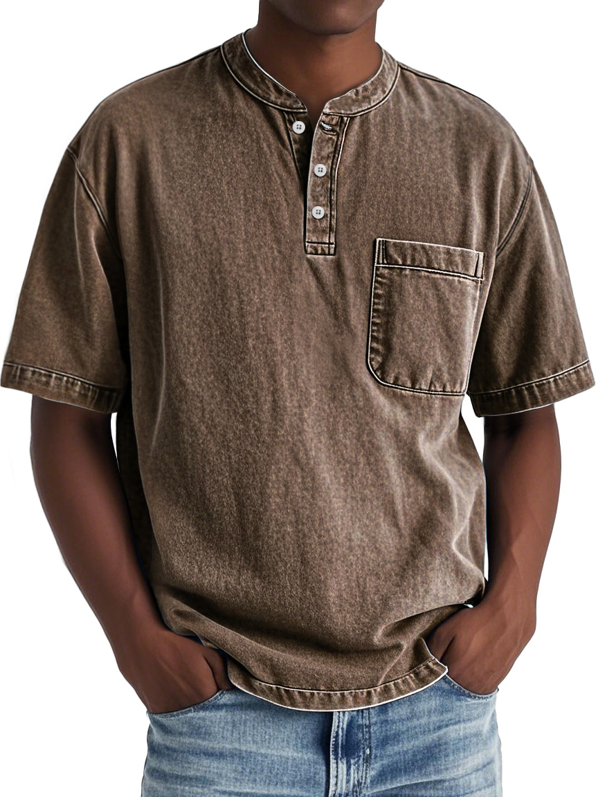 Men's Vintage Distressed Stand Collar Pocket Casual Short Sleeve Henley Shirt