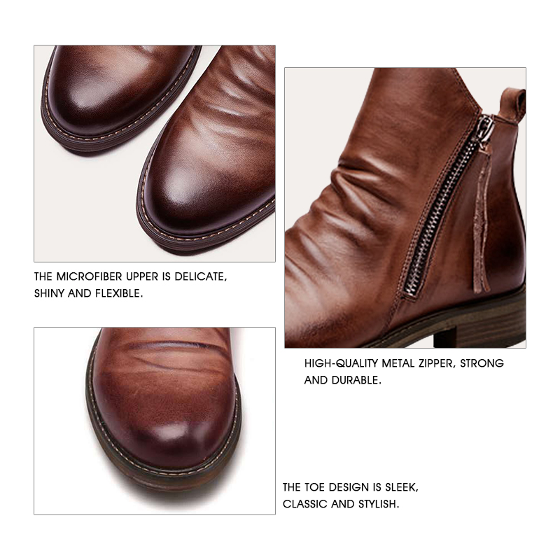 The design of the side zipper makes it no trouble to put on and take off the boots. You can easily open the boots with a simple pull. The Genuine Leather is soft and skin-friendly, with good wrapping and easy to take care of.