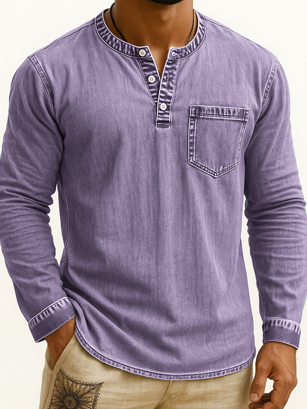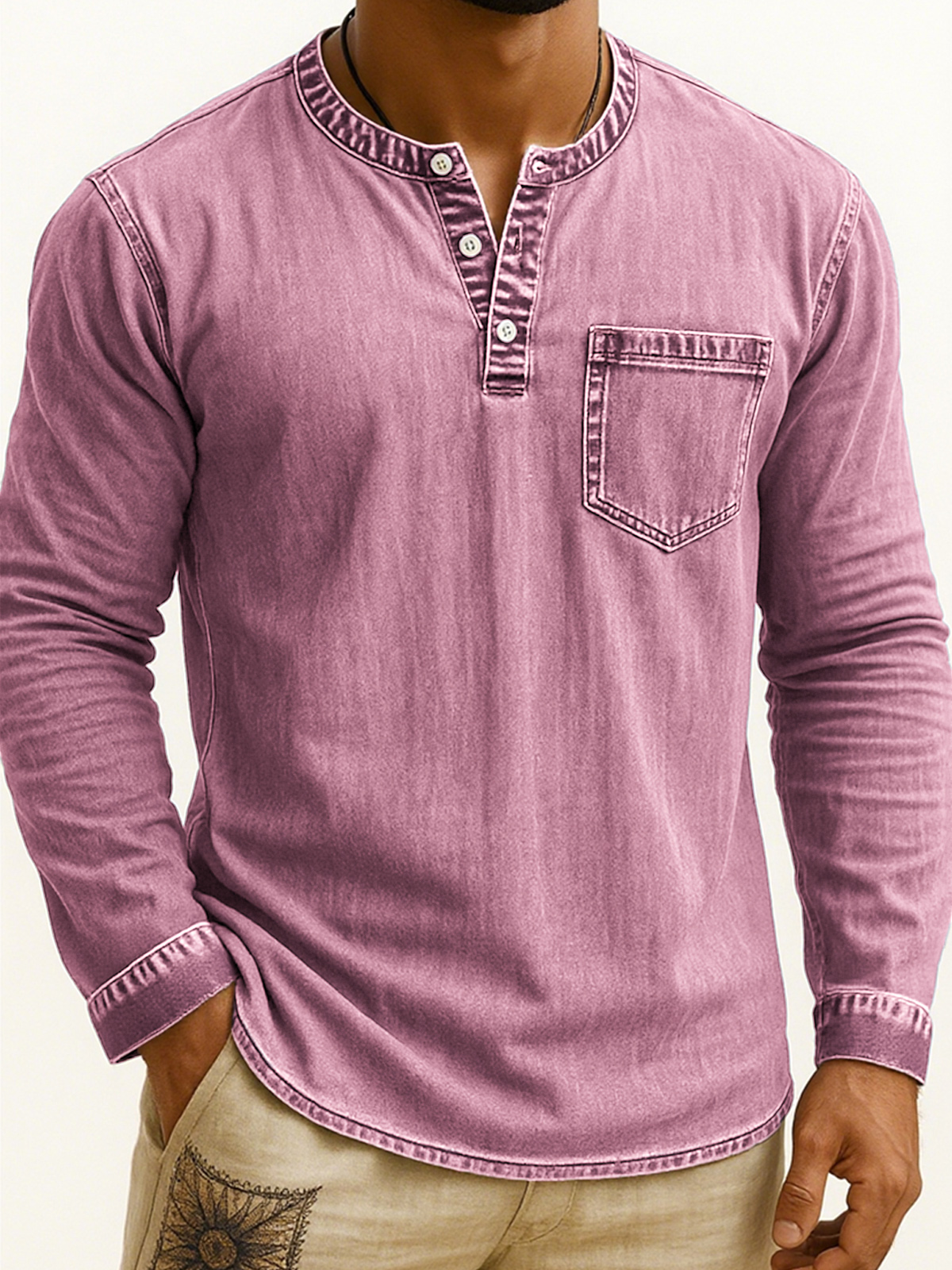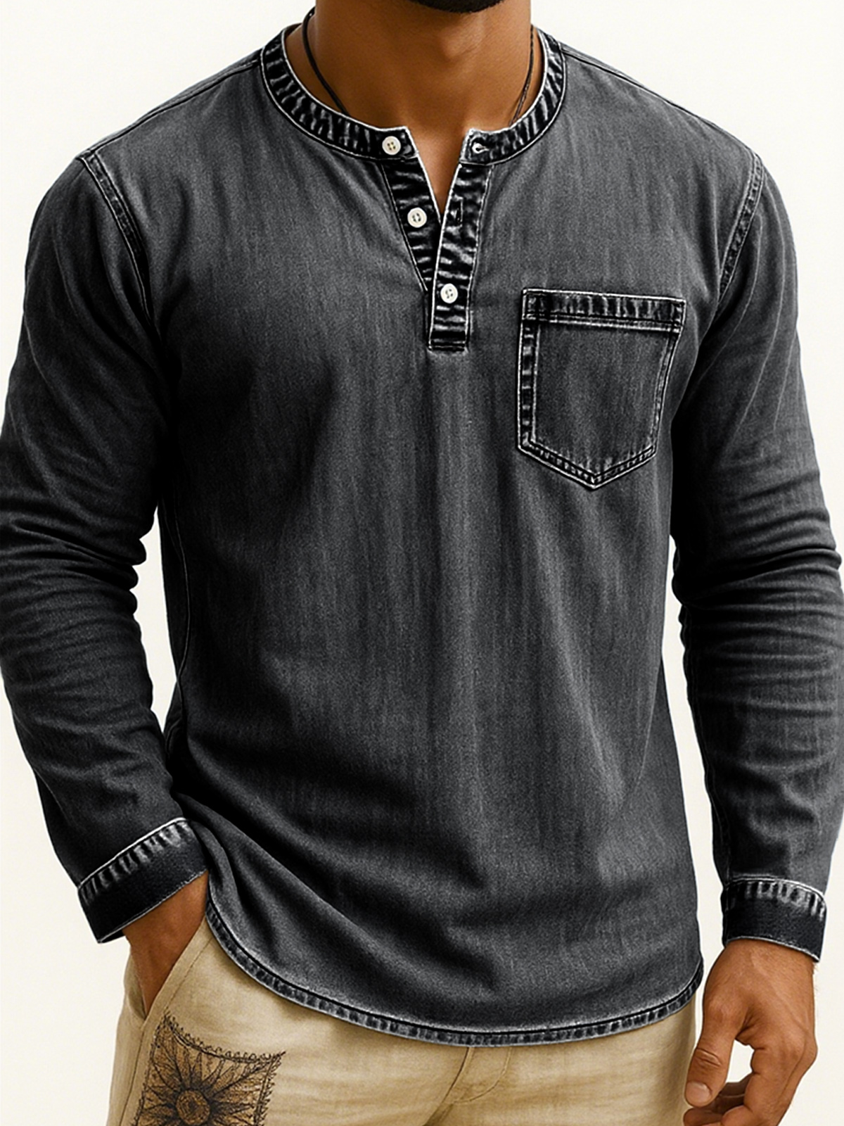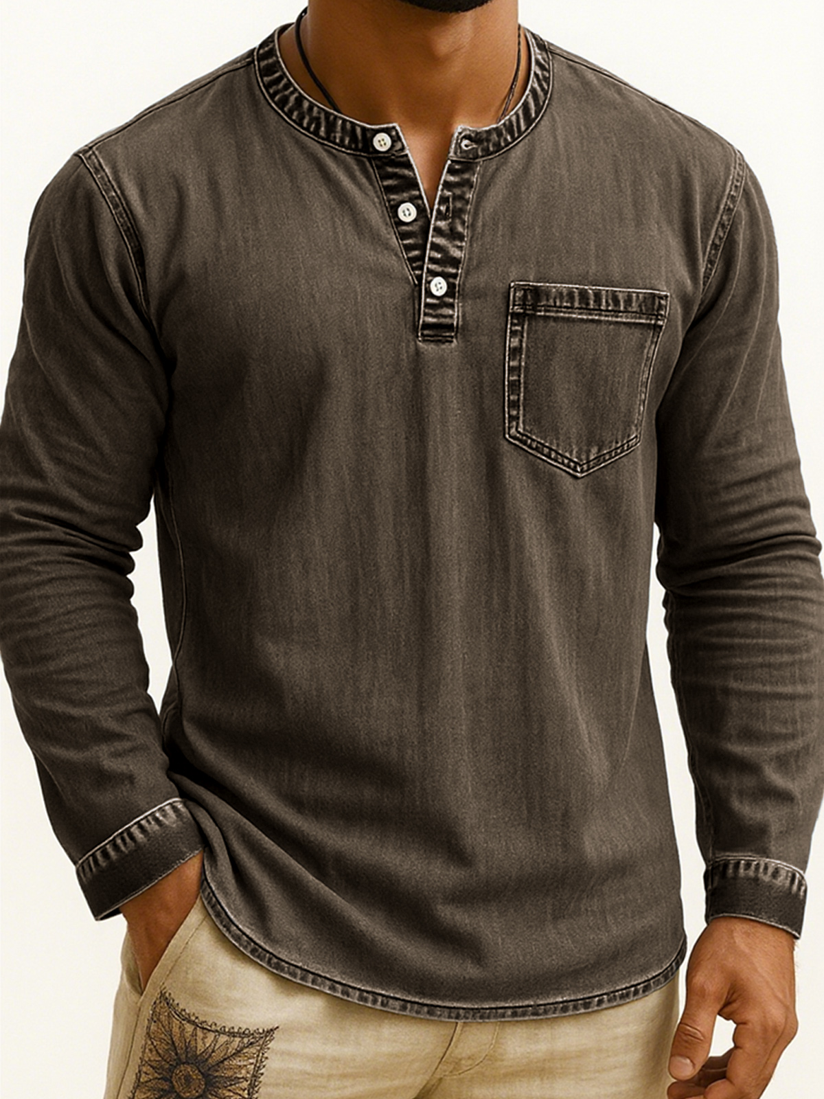 Men's Vintage-style Long-sleeve Henley Shirt with Pockets