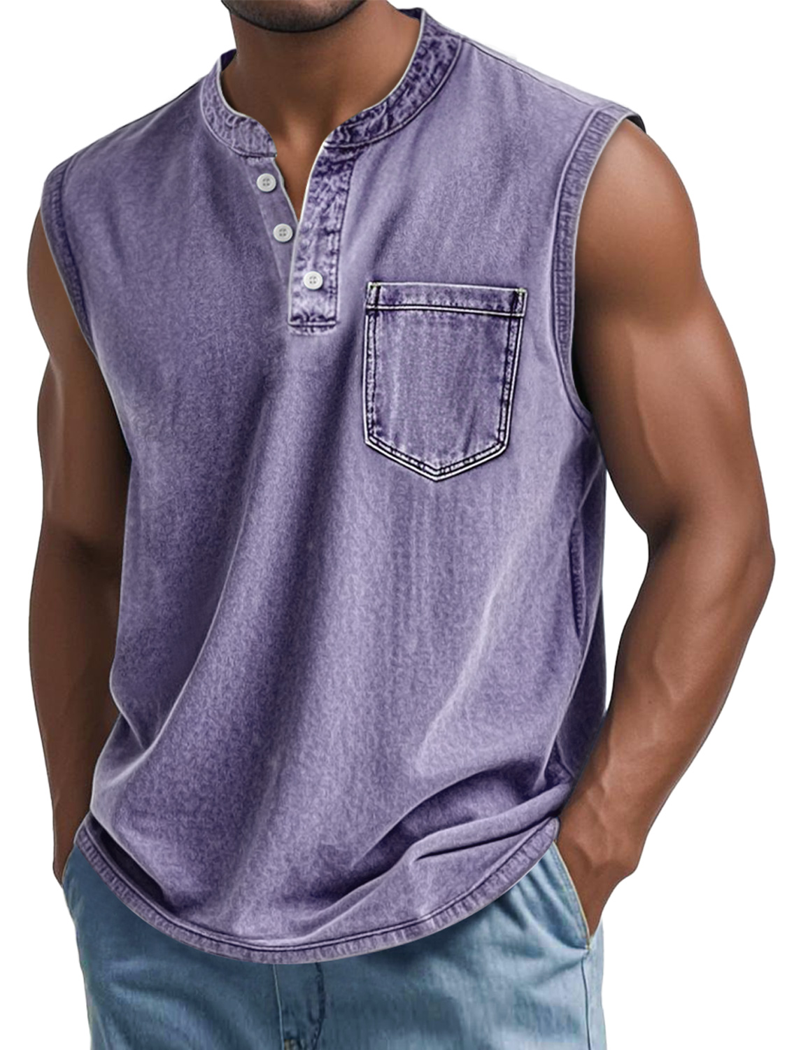 Men's Vintage Washed Cotton Stand Collar Pocket Casual Sleeveless Henley Vest