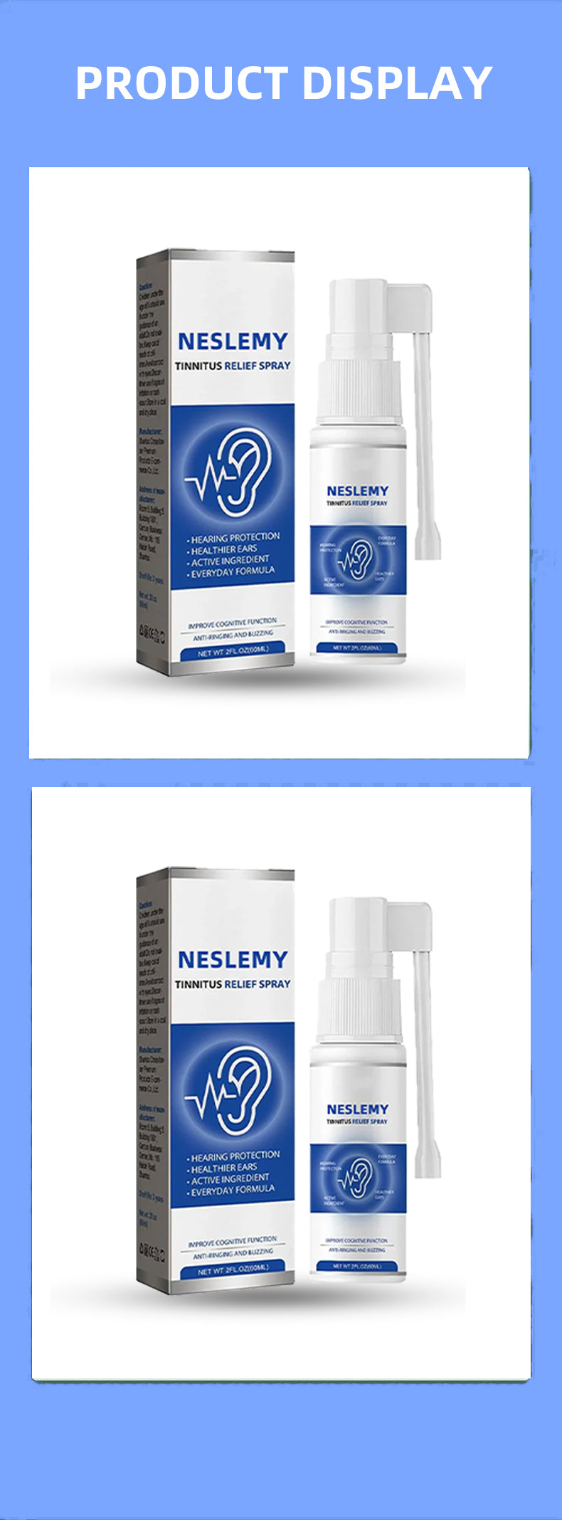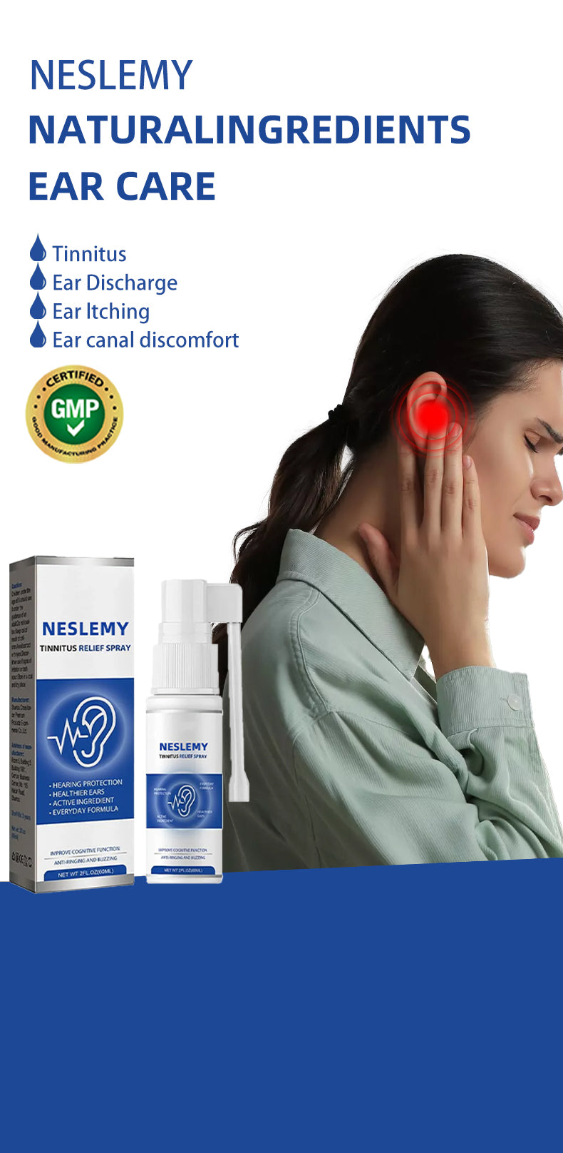 A:  NESLEMY™ is designed for various ear issues and all age groups. Whether you have mild tinnitus from work environments or long-term chronic tinnitus; whether you're a young professional or a retired senior, NESLEMY™'s multi-layered formula can address your specific situation.