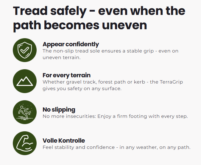 The TerraGrip orthopaedic running & hiking shoe excels where many others fail: with its specially developed tread sole, it offers optimum grip on any surface - whether in the forest, on gravel or in everyday life. While conventional hiking boots are often heavy, stiff or slippery, the TerraGrip combines lightness, an ergonomic fit and real surefootedness. It was developed with orthopaedists to specifically prevent foot, knee and back pain - for healthy walking with maximum comfort.