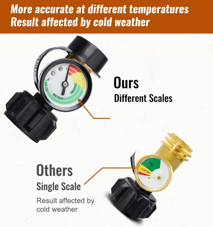 100% BRASS MADE – PatioGem propane cylinder gauges is CSA certificated. Heavy duty 100% solid brass construction withstands weather, scratching, denting and corroding, providing secure, air-tight connection between propane cylinder. Just add it into cart, PatioGem lp tank gauge will be a good accessory that supports you to monitor your gas level in real time!