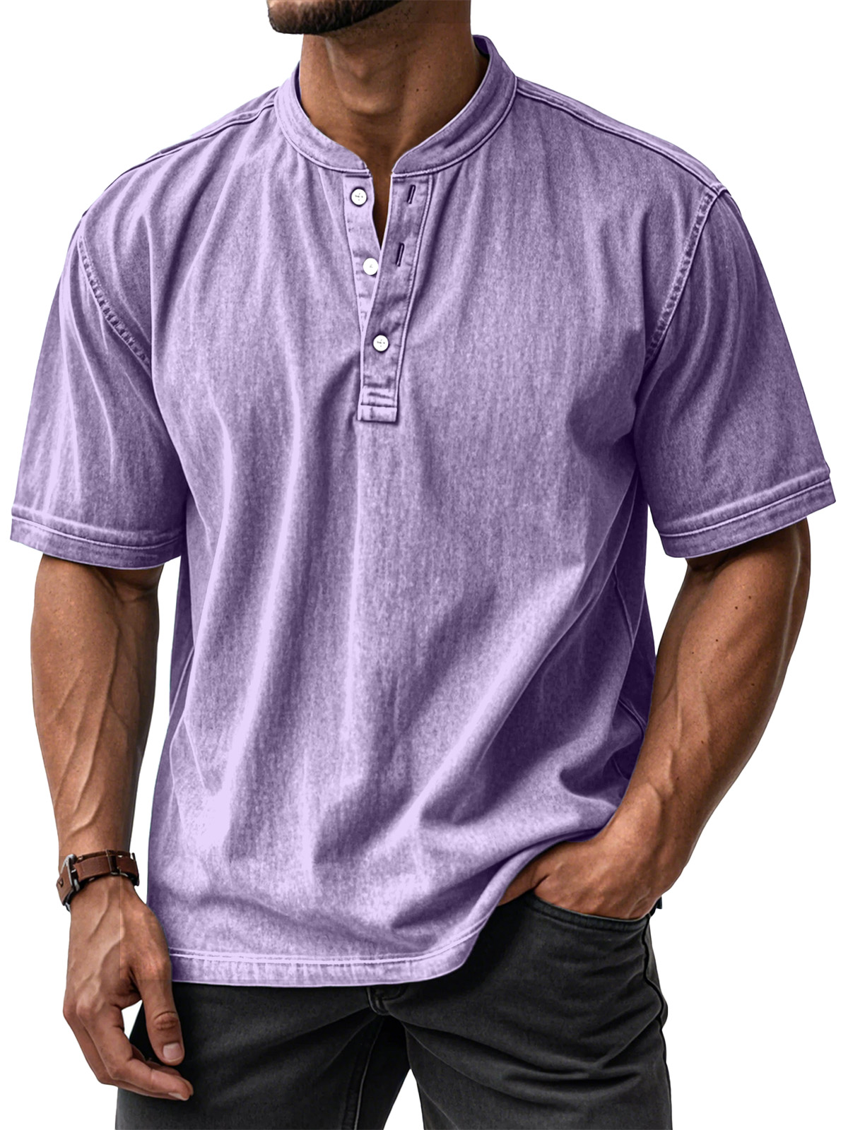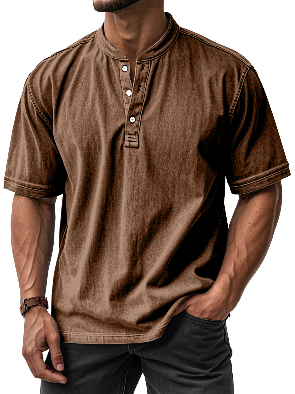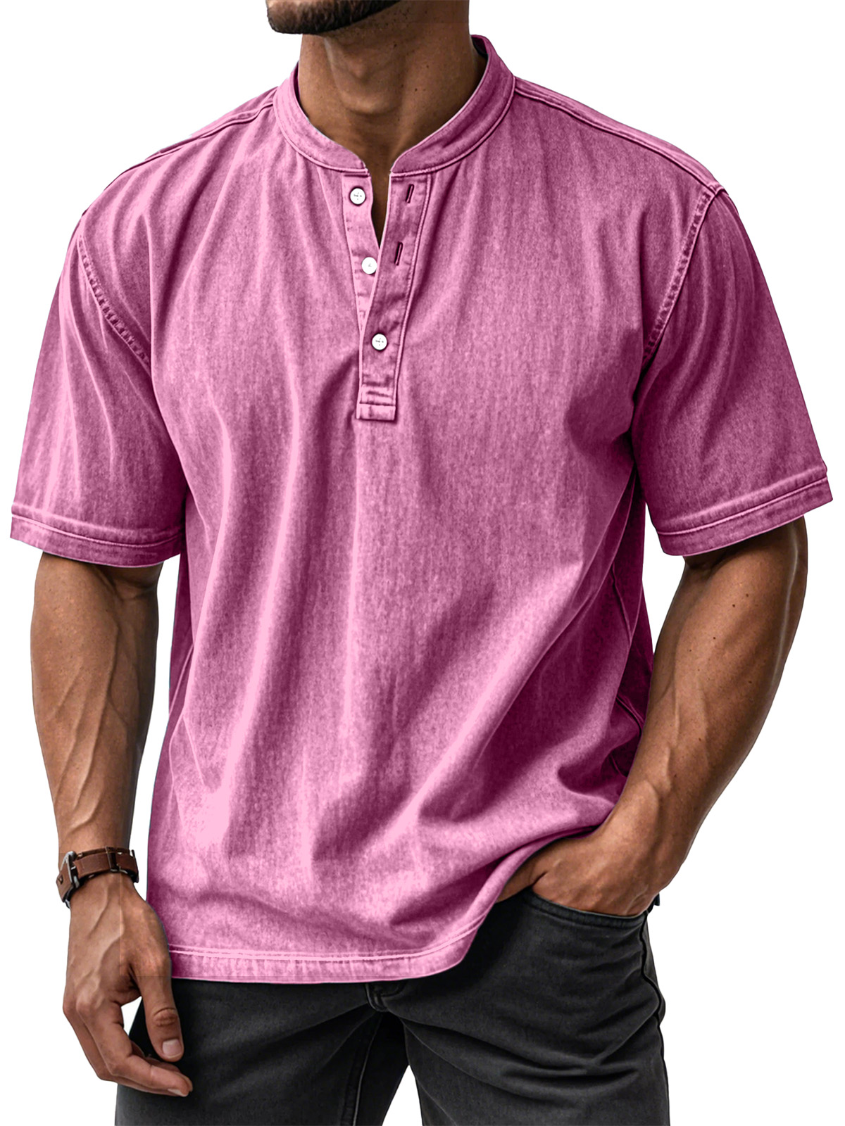 Men's Casual Solid Color Vintage Loose Short Sleeve Button-down Henley Shirt