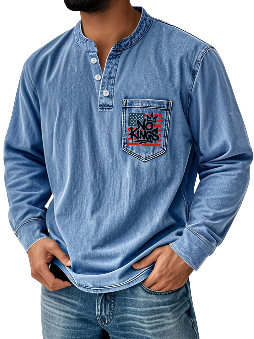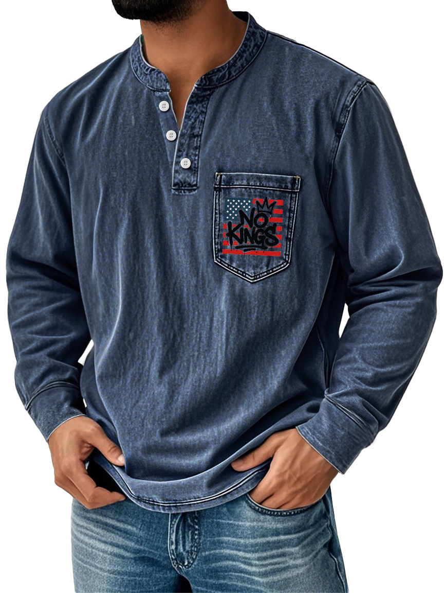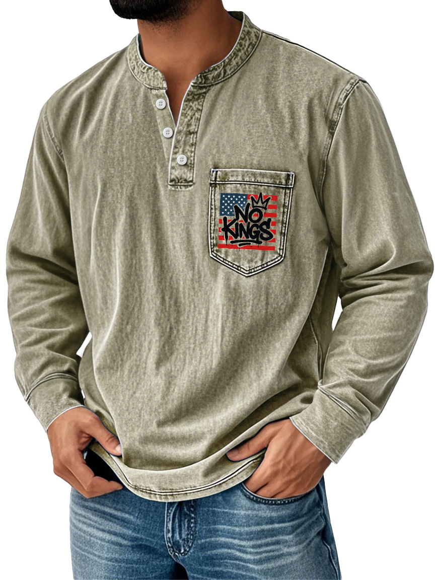 Men's Vintage No Kings Stand Collar Button Pocket Casual Long Sleeve Henley