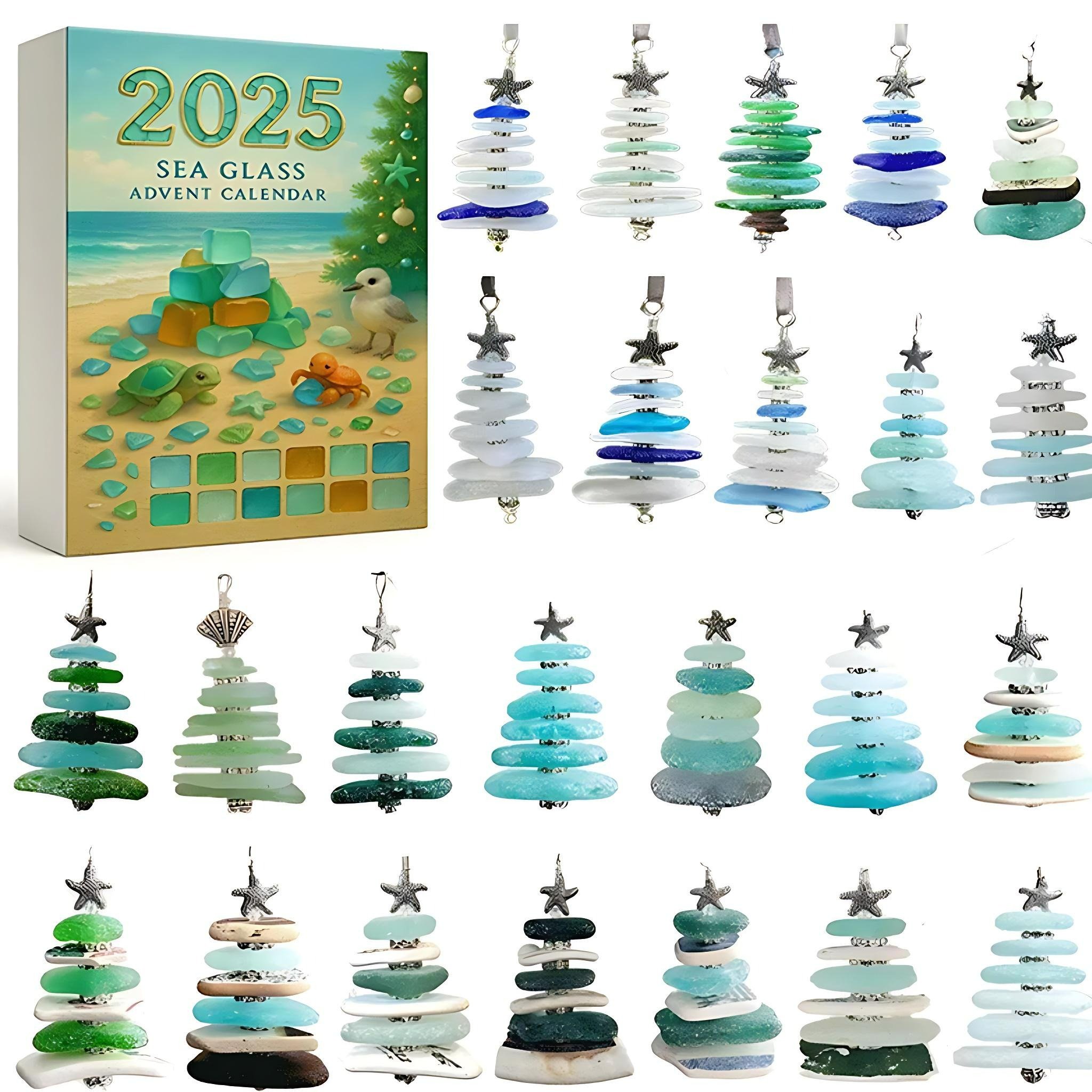 The Sea Glass Christmas Tree Advent Calendar 2025 features 24 handcrafted miniature Christmas trees crafted of green, aqua, blue, and white. Each Christmas tree is stacked from smooth pieces of Acrylic and topped with a charming decoration like a silver starfish, a seashell, or beads, giving each tree its own unique coastal charm. Every tree has variations in shape and color, making it a natural and artistic addition to your holiday decorations.